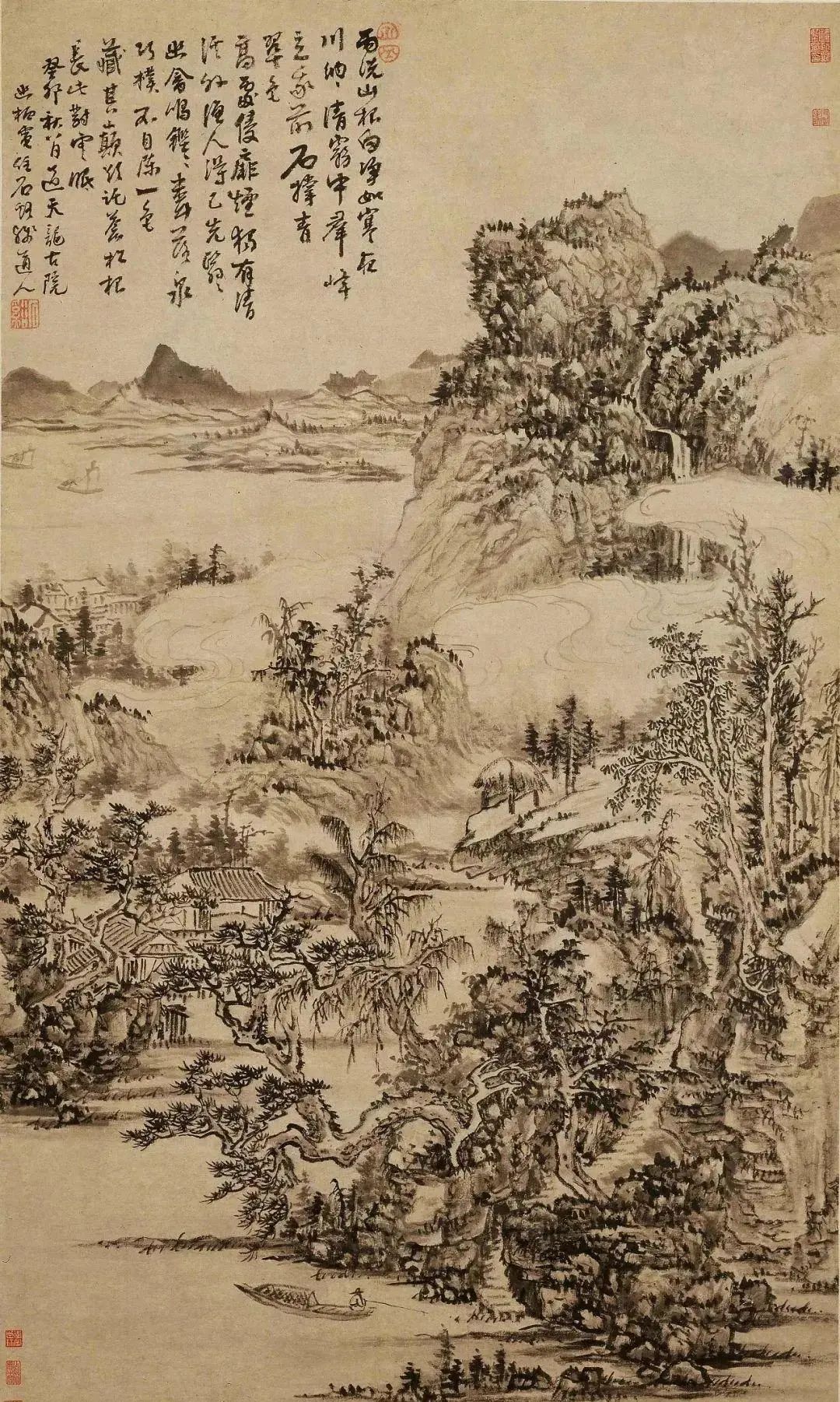 丙午深秋,青谿大居士枉驾山中,留榻经旬,静谈禅旨护六法之微,论画精髓者必多览书史,登山穷源,方能造意。然大居士为当代名儒,至残衲不过天地间一个懒汉,晓得什么画来。余向尝宿黄山,见朝夕云烟幻景,林木翳然,非人世也。居士遂出端本堂纸四幅,随意属图,聊记风味云耳。居士当棒喝教我,石谿残道者爪。